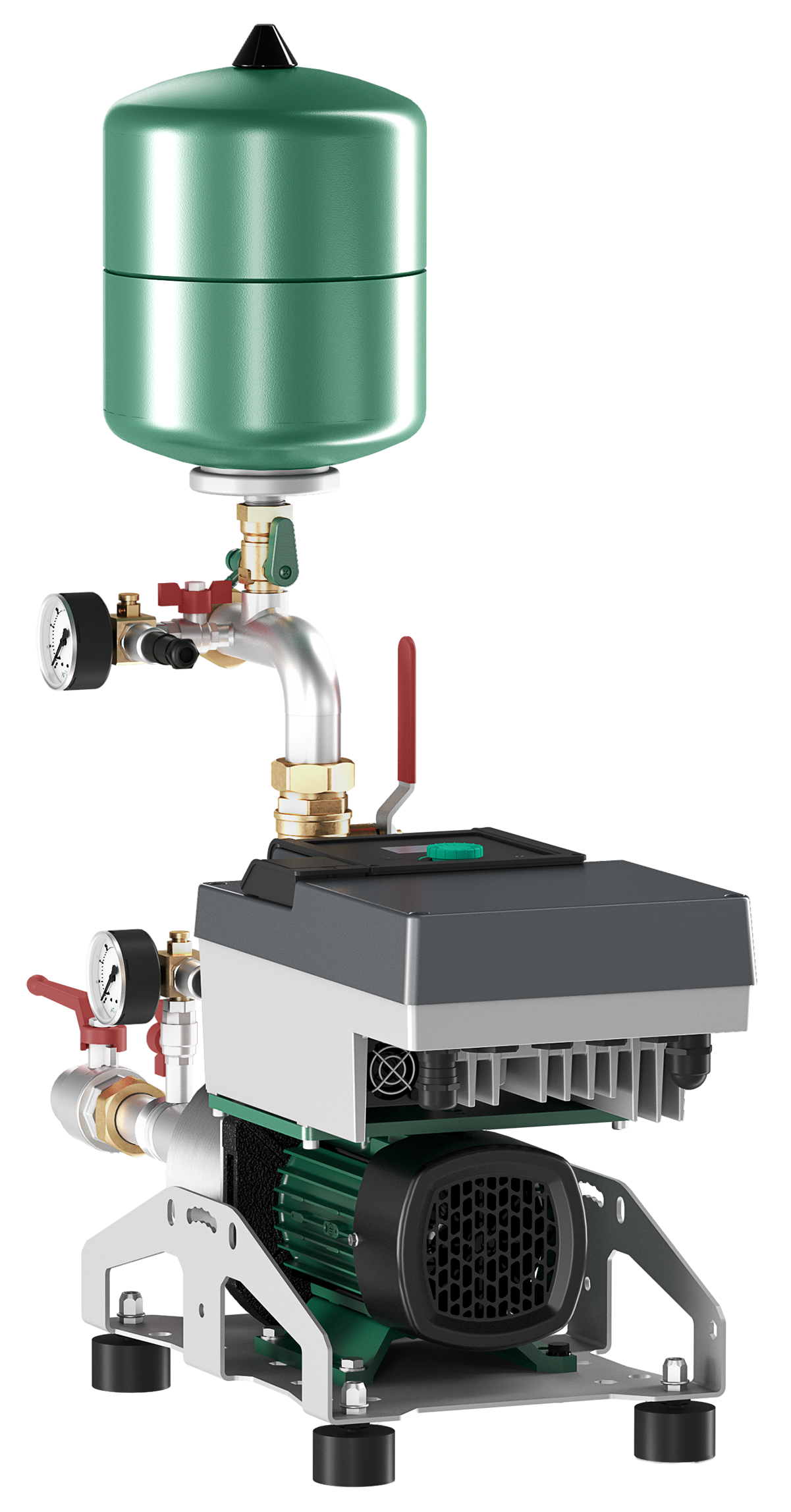• Diaphragm pressure vessel: 8 l/PN 10 on the end pressure side with butyl rubber diaphragm, completely safe according to the food safety regulations; ball valve and drain and throughflow fitting according to DIN 4807 for test and inspection purposes